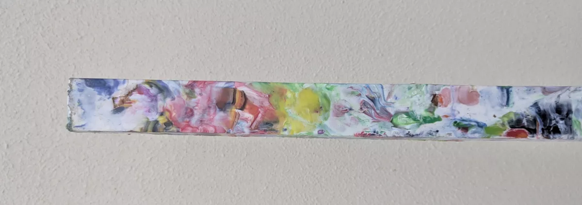 Le produit final est une barre solide de 2 x 4 x 40 cm, présentant une section rectangulaire homogène et multicolore due à la variété des bouchons HDPE utilisés. La densité est élevée grâce au pressage, rendant la barre résistante et adaptée comme pièce brute pour un pied de tabouret, de chaise ou d'autres éléments mobiliers.